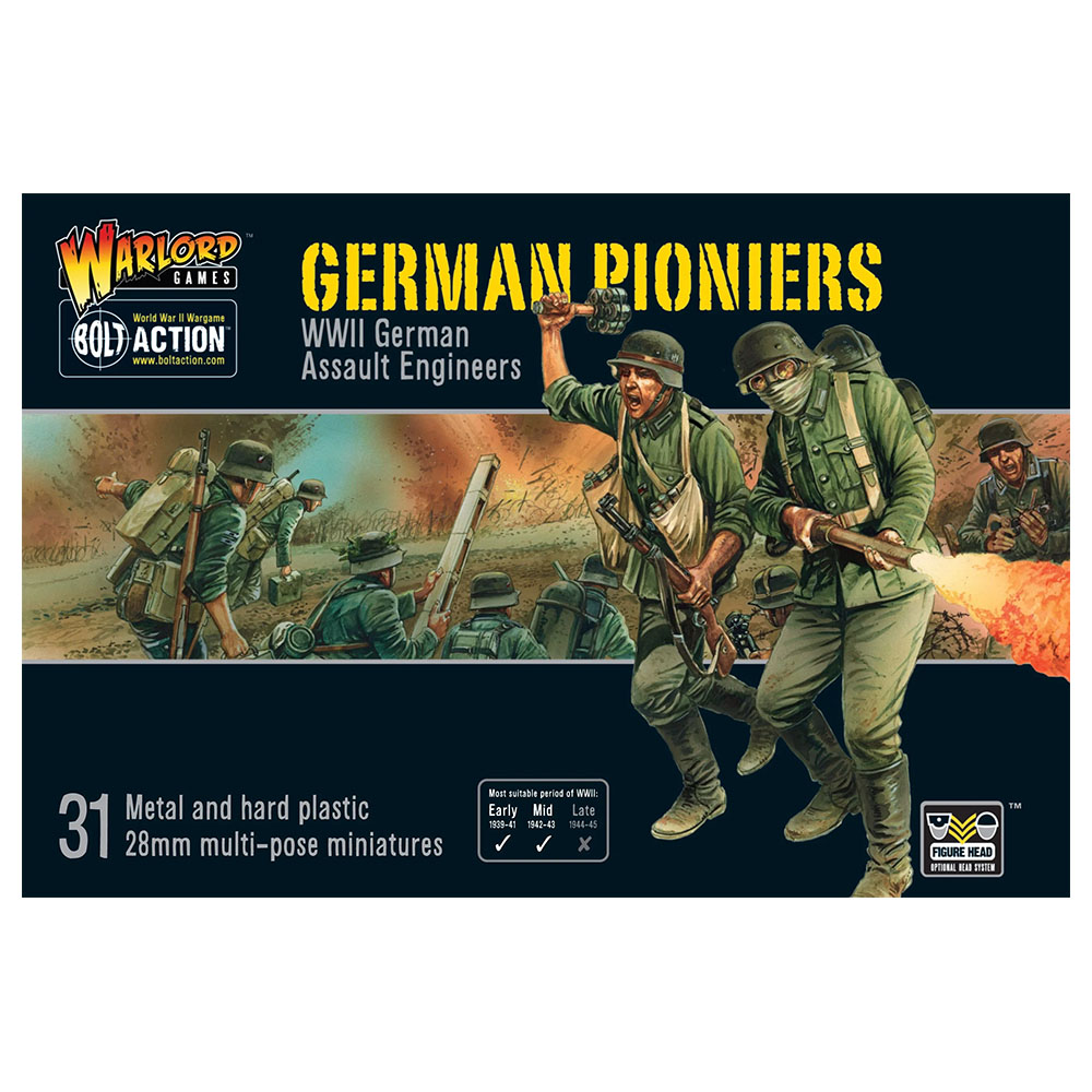 - Enough plastic and metal components to make 31 German Pionier miniatures. Includes a host of options to allow for different weapon configurations and command models.