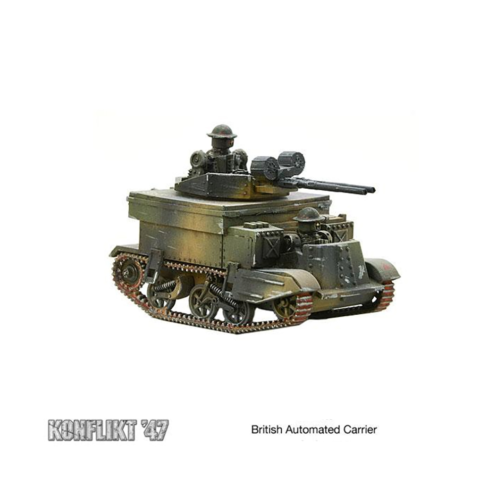 Using the ubiquitous universal carrier as a base, two automated infantry units are hardwired into the vehicle, one as a driver and the other as a gunner. With any redundant limbs or body parts removed, the AI units take little space which allows a mounting of a twin auto-cannon weapon system. This firepower would be unworkable with a human crew due to the recoil, noise levels and cramped crew space, but works with automated crew perfectly.