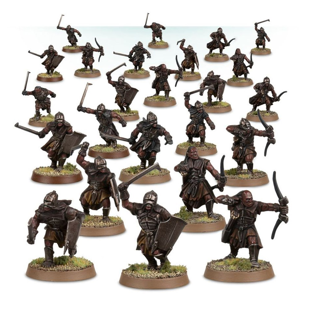 This plastic boxed set contains 26 components, with which to build 24 Uruk-hai Scouts: 8 with sword and shield, 8 with sword, and 8 with bow.